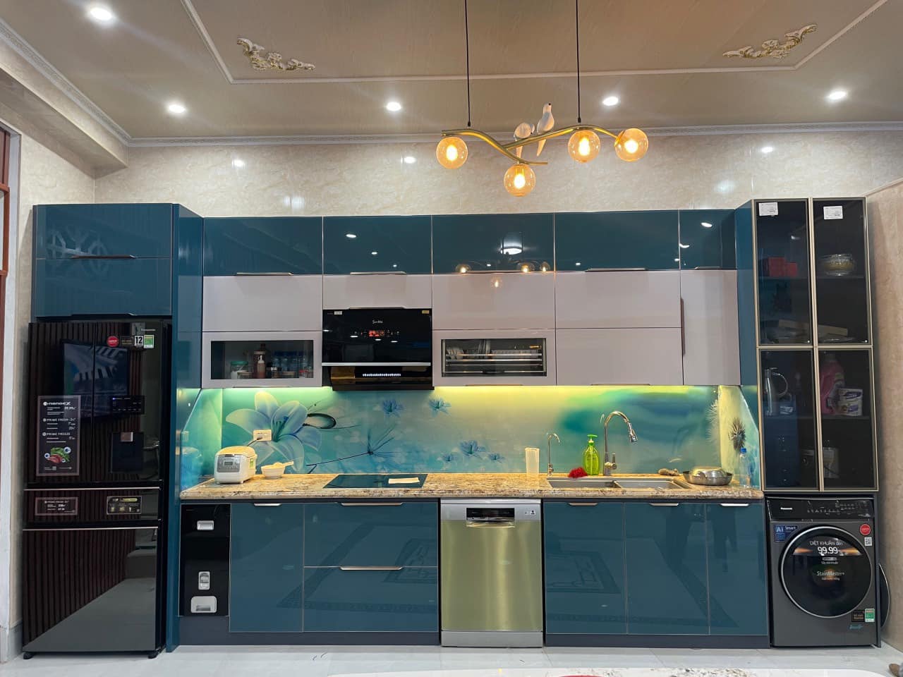 Mẫu tủ bếp thùng inox 304, cánh kính màu xanh dương phối trắng tại Nội Thất Doni Home Ninh Bình chính là lựa chọn hoàn hảo cho những ai yêu thích phong cách hiện đại, bền bỉ và sang trọng.